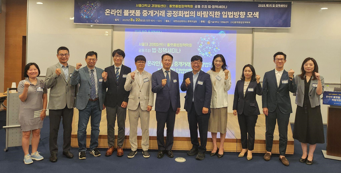 경쟁법센터(센터장 이봉의 교수)는 2025년 8월 22일(금) 대한상공회의소 중회의실B에서 ‘온라인 플랫폼 중개거래 공정화법의 바람직한 입법방향 모색’이라는 주제로 플랫폼법정책학회와 공동으로 법.정책세미나를 개최하였다.