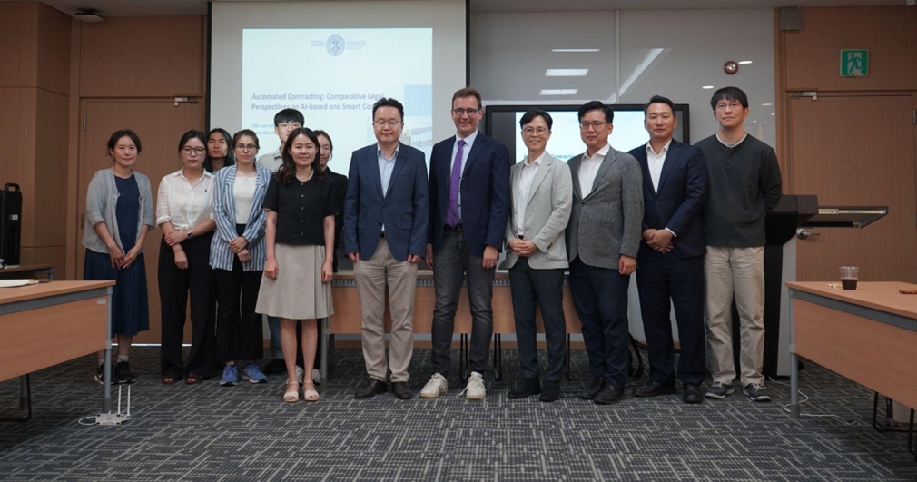 아시아태평양법연구소(소장 전종익 교수)는 2025년 9월 5일(금) 서울대학교 법학전문대학원 15-1동 본 연구소 세미나실에서 제74회 Asia-Pacific Law Forum을 개최하였다. 이날 포럼에서는 오영걸 교수(서울대 법전원)의 진행과 소개로 Marburg 대학 교수인 Florian Möslein이 “Automated Contracting: Comparative Legal Perspectives on AI-based and Smart Contracts(자동화 계약: AI 기반 계약과 스마트 계약에 대한 비교법적 관점)”이라는 주제로 발표하였다. 포럼에서는 정준혁 교수, 오영걸 교수, 천경훈 교수, 최준규 교수, 공두현 교수, 이혜민 교수(이상 서울대 법전원) 및 학생들이 참석하여 토론과 질의응답 시간을 가졌다.