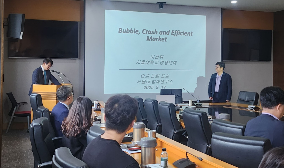 법학연구소(소장 전원열 교수)는 2025년 9월 17일(수) 서울대학교 법학전문대학원 17동 서암홀에서 제503회 「법과 문화」 포럼을 개최하였다. 이관휘 교수[서울대 경영대학(원)]가 “Bubble, Crash and Efficient Market”이라는 흥미로운 주제로 이번 학기 포럼의 첫 시작을 알렸다. 발표는 과거와 오늘날의 자산시장을 화두로 하여 화기애애한 분위기 아래 이어졌으며, 발표 후에는 질의응답이 진행되었다.