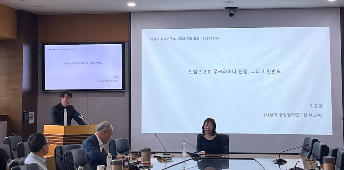 법학연구소(소장 전원열 교수)는 2025년 9월 24일(수), 17동 서암홀에서 제504회 「법과 문화」 포럼을 개최하였다. 이번 포럼에서 이문영 교수(서울대 통일평화연구원)는 “트럼프 2.0, 우크라이나 전쟁, 그리고 한반도”라는 주제로 발표하였다. 트럼프 정부의 정책선회, 우크라이나의 위기, 한반도의 국제정세 등 여러 내용을 다루는 발표가 이루어졌으며, 발표 후에는 열띤 질의응답이 진행되었다.