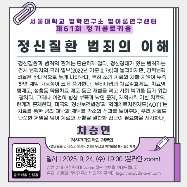 서울대학교 법학연구소 법이론연구센터(센터장 김도균)는 2025년 9월 24일(수) 비대면으로 “정신질환 범죄의 이해”라는 주제의 제61회 정기 콜로키움을 진행하였다. 콜로키움에서는 정신건강의학과 전문의이자 <법정으로 간 정신과 의사>, <나의 무섭고 애처로운 환자들>의 저자 차승민 원장(아몬드정신건강의학과)이 강연하였다. 차승민 원장은 강연에서 정신질환과 범죄의 관계는 단순하지 않다며, 정신장애가 있는 범죄자는 전체 범죄자의 극히 일부(2022년 기준 0.7%)에 불과하지만, 강력범죄 비율은 상대적으로 높게 나타난다고 설명했다. 이러한 상황에서 차승민 원장은 미국의 ‘정신보건법정’과 ‘외래치료지원제도(AOT)’는 치료를 통한 범죄 예방과 재범률 감소의 성과를 보여주며, 우리 사회도 단순한 처벌을 넘어 치료와 재활을 결합한 접근이 필요한 상황임을 강조했다.