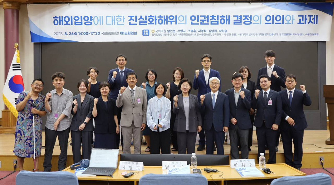 공익법률센터(센터장 이봉의)는 2025년 8월 26일(화) 국회의원회관에서 공익인권법재단 공감, 사단법인 온율, 국회의원 남인순 등과 공동으로 '해외입양에 대한 진실화해위원회의 인권침해 결정의 의의와 과제' 토론회를 개최해 성황리에 마무리했다. 이번 토론회는 지난 3월 25일(화) 진실화해를위한과거사정리위원회(이하 ‘진화위’)가 한국 해외입양 과정에서 국가기관에 의한 중대한 인권침해가 있었음을 인정한 진실규명 결정에 대한 후속 조치 및 입양인들의 뿌리에 대한 권리(right to origin)를 논의하기 위해 마련되었다. 수십 년간 자신의 뿌리를 찾기 위해 외로운 싸움을 이어온 해외입양인 당사자들의 용기 있는 활동이 이끌어낸 역사적인 결정 이후, 실질적인 피해 회복을 위한 구체적인 방안을 모색하는 첫 국회 토론회라는 점에서 의미가 깊다.