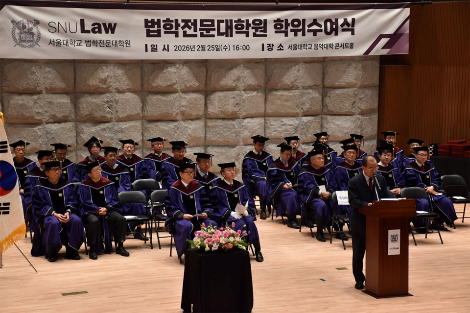 2026년 2월 25일(수) 서울대학교 법학전문대학원 학위수여식이 서울대학교 음악대학 콘서트홀에서 개최되었다. 학위수여식은 이재민 원장의 축사와 허성욱 교무부원장의 학사보고로 시작되었다. 강용현 서울법대 동창회장의 축사와 졸업생 대표 2인의 답사 후 참석 졸업생에 대한 학위 수여와 상장 수여가 진행되었다.