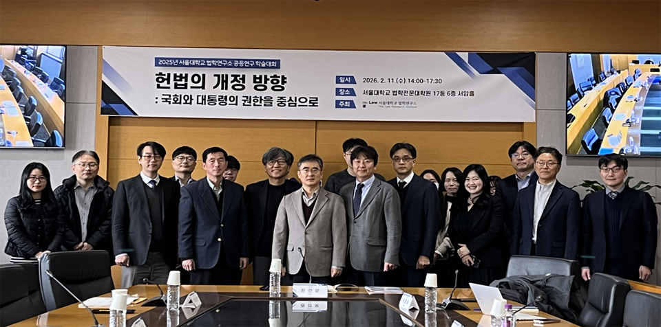 서울대학교 법학연구소(소장 전원열 교수)는 2026년 2월 11일(수) 17동 서암홀에서 ‘헌법의 개정 방향 : 국회와 대통령의 권한을 중심으로’를 주제로 2025학년도 마지막 공동연구 학술대회를 개최하였다. 이번 학술대회에서는 전상현 교수(서울대 법전원)를 연구책임자로 본 법학전문대학원의 교수들이 공동연구진으로 참여하여, 해당 주제에 대한 지난 1년간의 연구성과를 공유하였다.