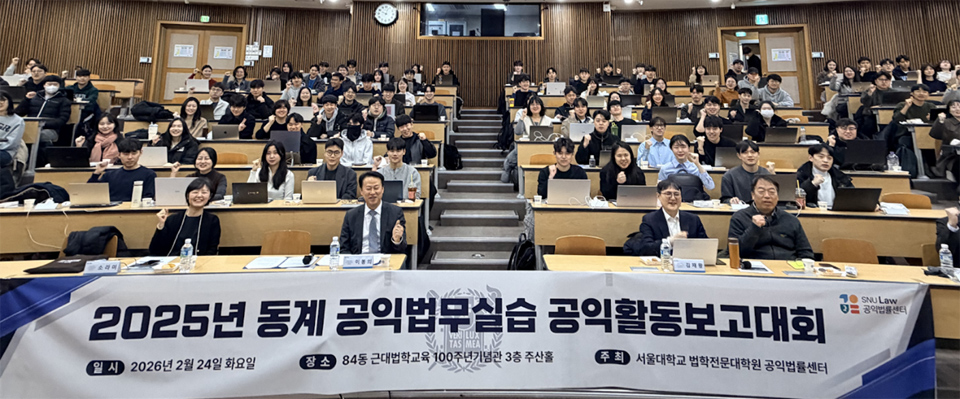 서울대학교 법학전문대학원 공익법률센터(센터장 이봉의)는 2026년 2월 24일(화) 근대법학교육백주년기념관 주산홀에서 겨울방학 동안 전국 각지의 공익 현장에서 실전 경험을 쌓은 1학년 학생들과 함께 ‘제7회 동계 공익법무실습 발표대회’를 성황리에 개최하였다.