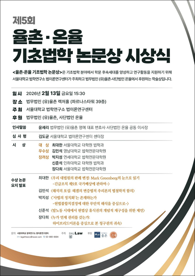서울대학교 법학연구소 법이론연구센터(센터장 김도균)가 2026년 2월 13일(금) 법무법인 율촌 렉처홀에서 ‘제5회 율촌·온율 기초법학 논문상’ 시상식을 개최하였다. 법이론연구센터는 2025년도 제5회 율촌·온율 기초법학 논문상 사업을 시행하여 전국 법학전문대학원생과 법학 관련 전공 대학원생을 대상으로 기초법학 분야의 논문을 공모하였다. 다양한 기초법학 분야에서서 다수의 우수한 논문이 출품되었고, 논문상 심사위원회(위원장 김도균 교수)는 2025년 11~12월 예심과 2026년 1월 본심을 거쳐 다음과 같이 5편의 수상작을 선정하였다.